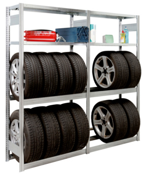 Space-saving storage of summer and winter tyres as well as car accessories, tools and small parts in a garage or workshop.